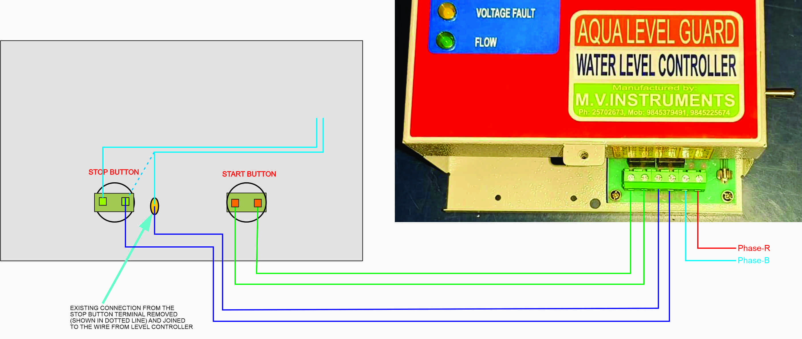STEP 5. Connect two wires, to "ON BUTTON PARALLEL CON." terminals of 6 way terminal block of Level Controller to the two terminals of ON button (i.e. Connect in parallel) without disturbing existing starter wires as shown in the diagram.